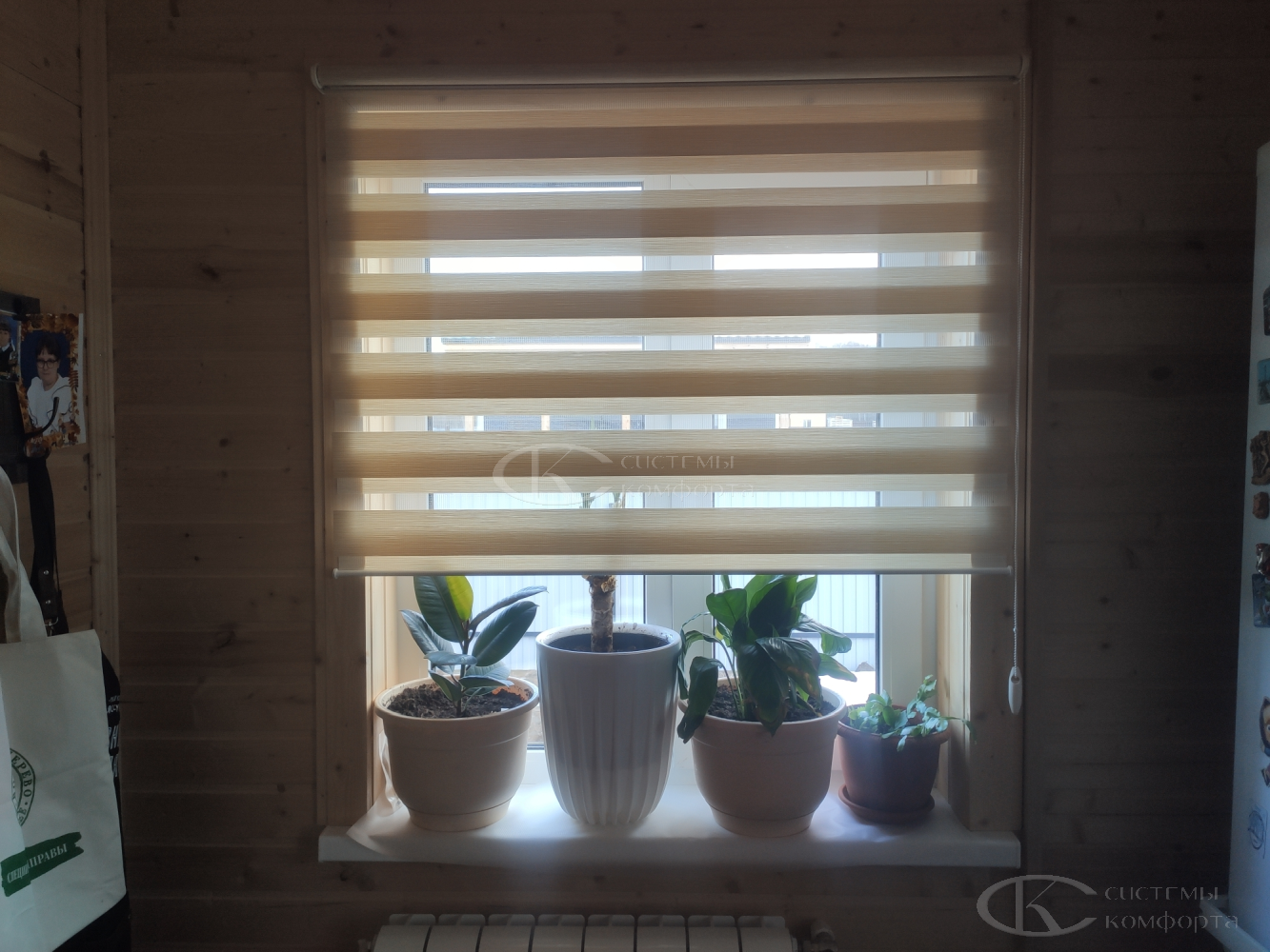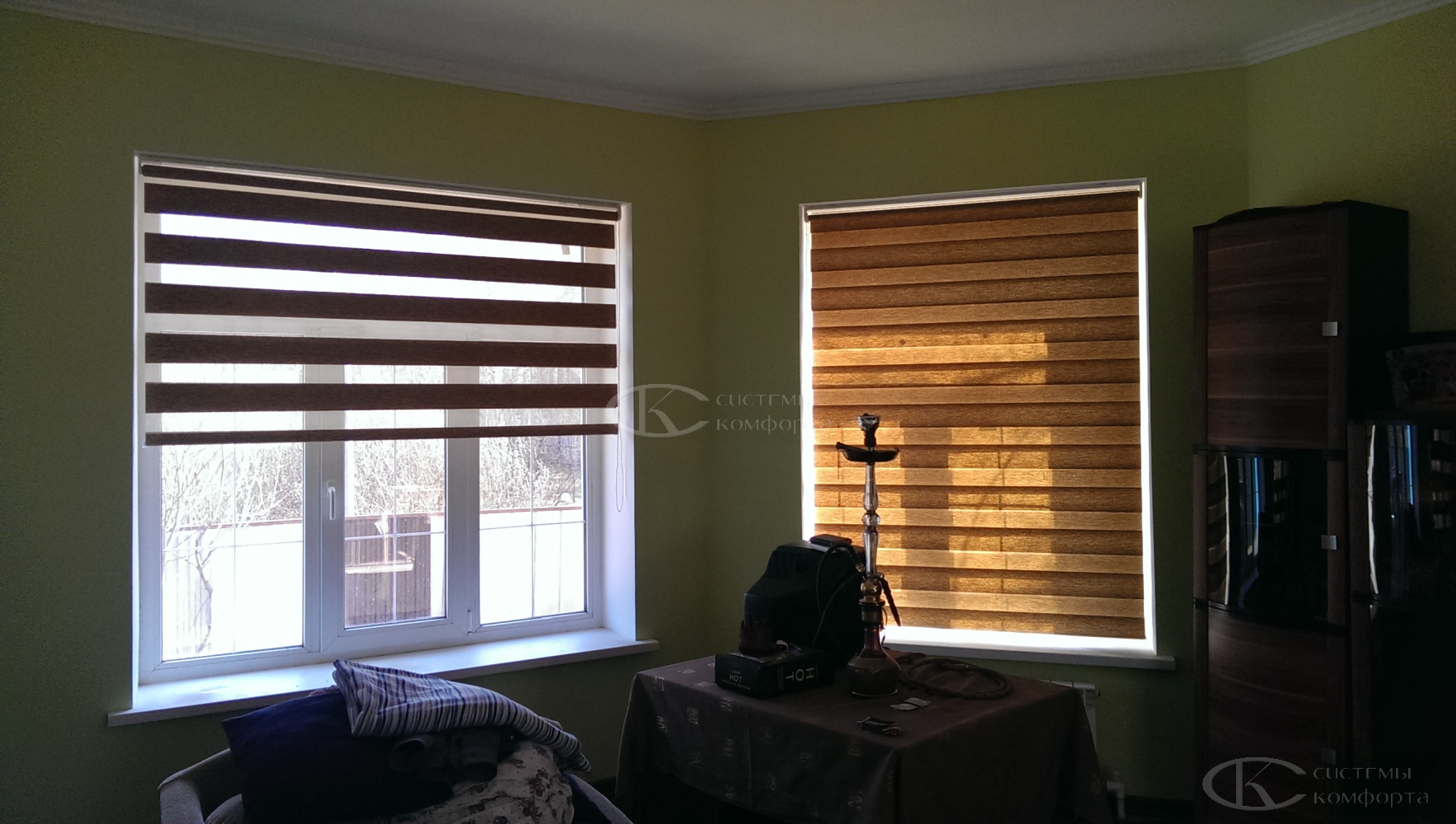 - Рулонные шторы «День-Ночь» («Зебра»). Инновационный продукт, ставший хитом для жилых помещений. Полотно состоит из чередующихся прозрачных и непрозрачных полос. Сдвигая их относительно друг друга, вы плавно регулируете освещенность от полупрозрачного мягкого света до полной приватности. Это удобное и функциональное решение для гостиной или кухни-столовой.