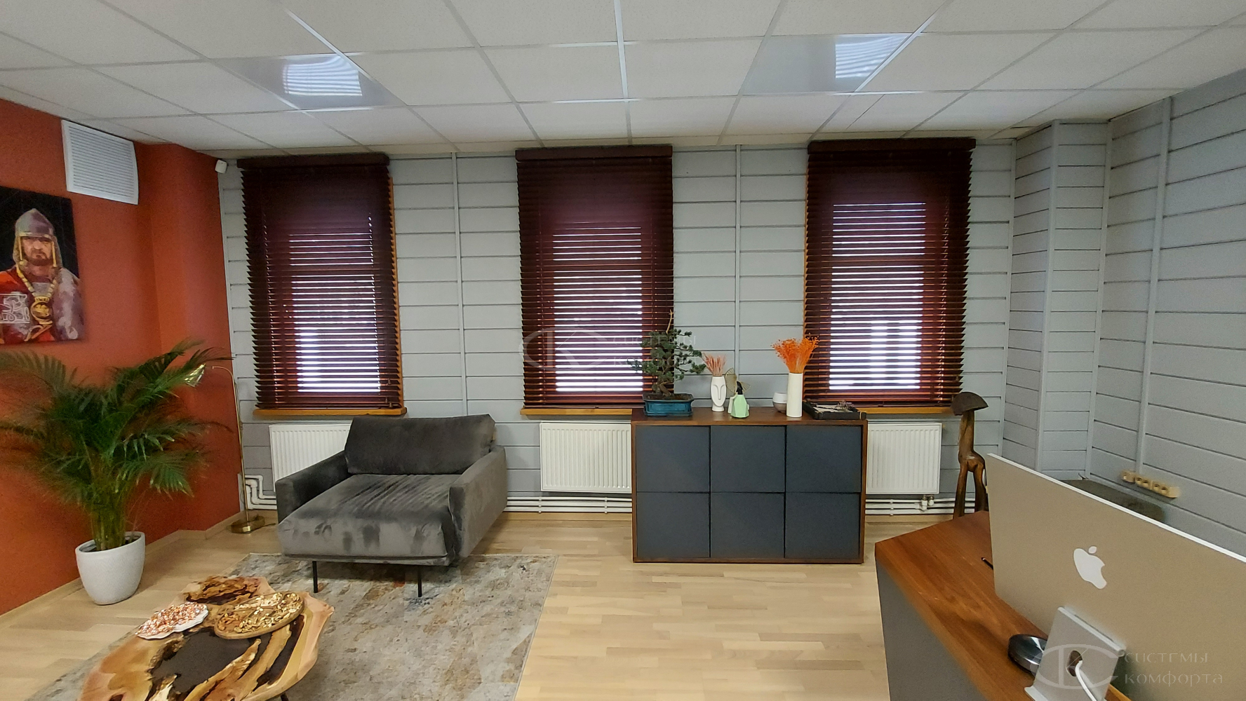 - Тип системы. Горизонтальные алюминиевые – наиболее бюджетный вариант, деревянные, римские шторы или системы с электроприводом будут дороже.