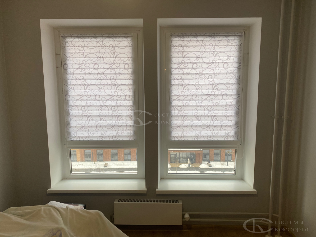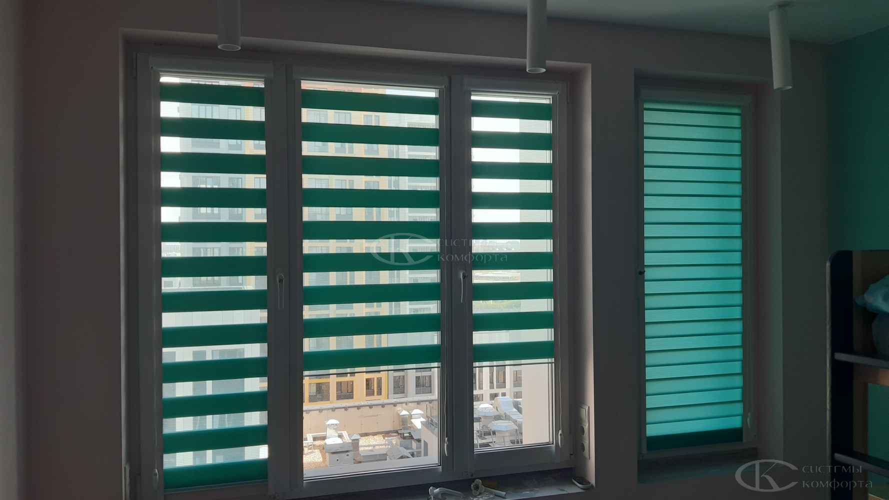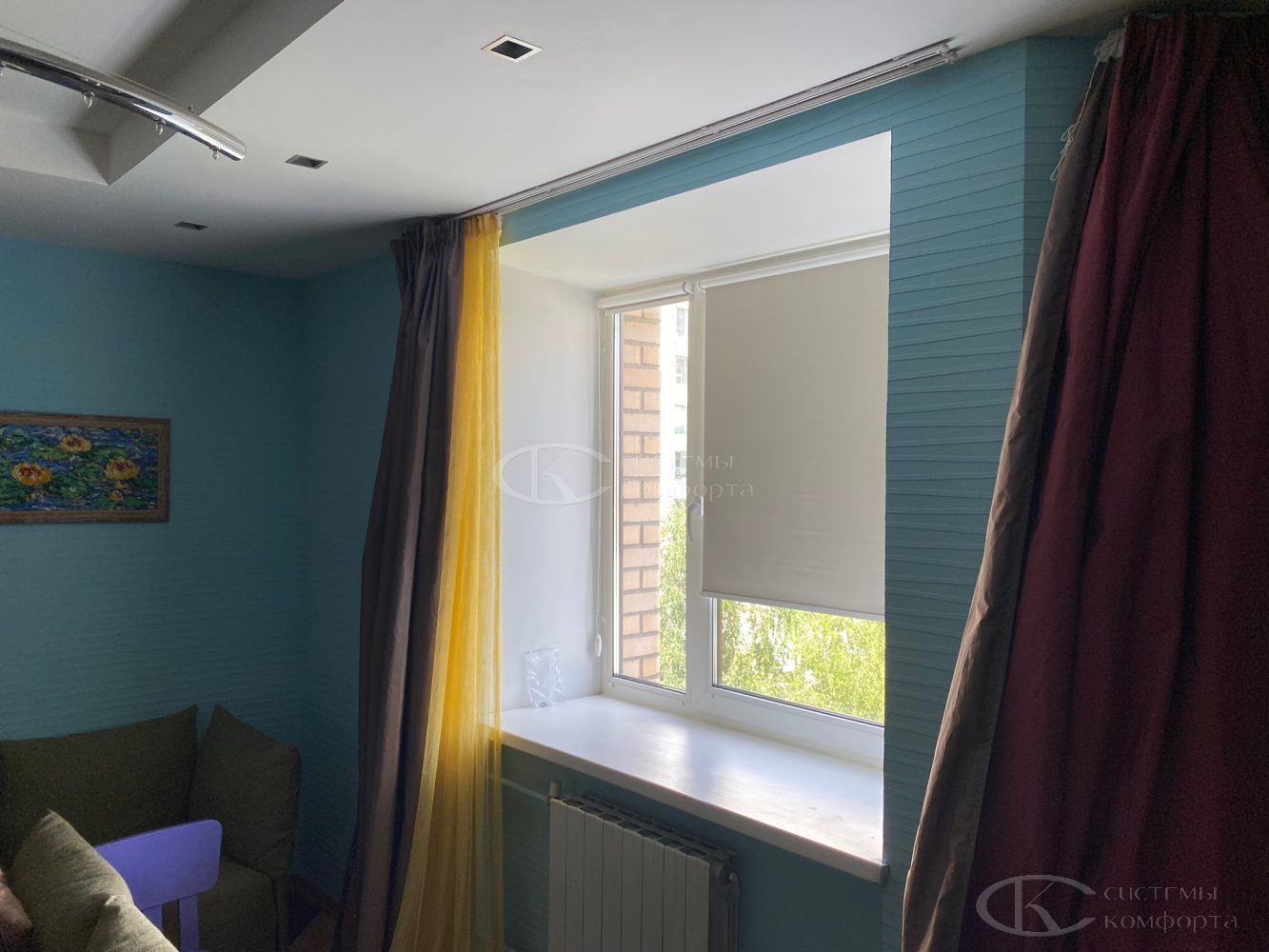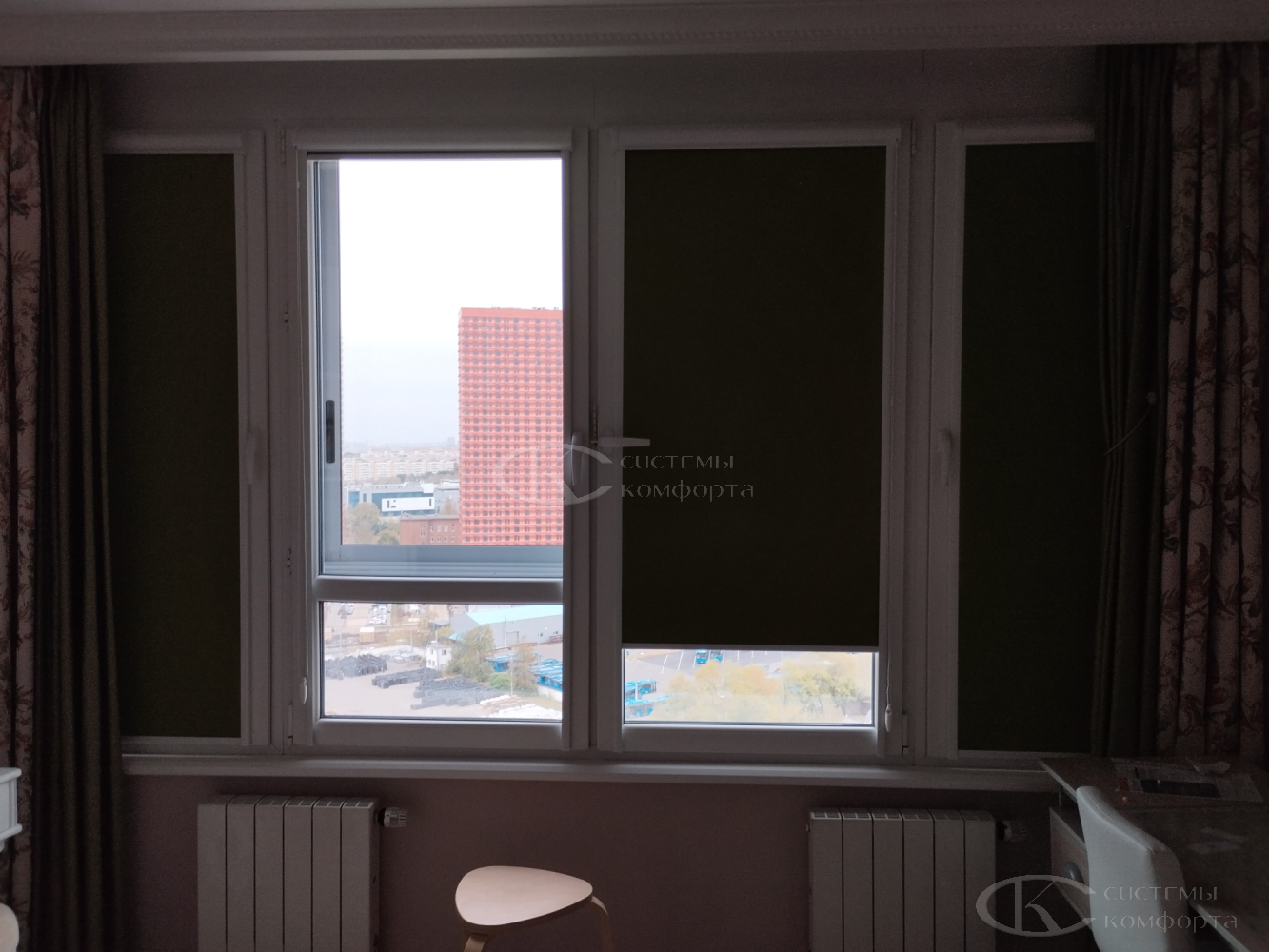 - Спальня/детская: контроль света и полное затемнение. Рулонные шторы «День-ночь», плотные тканевые римские или вертикальные модели, жалюзи с системой блэкаут.