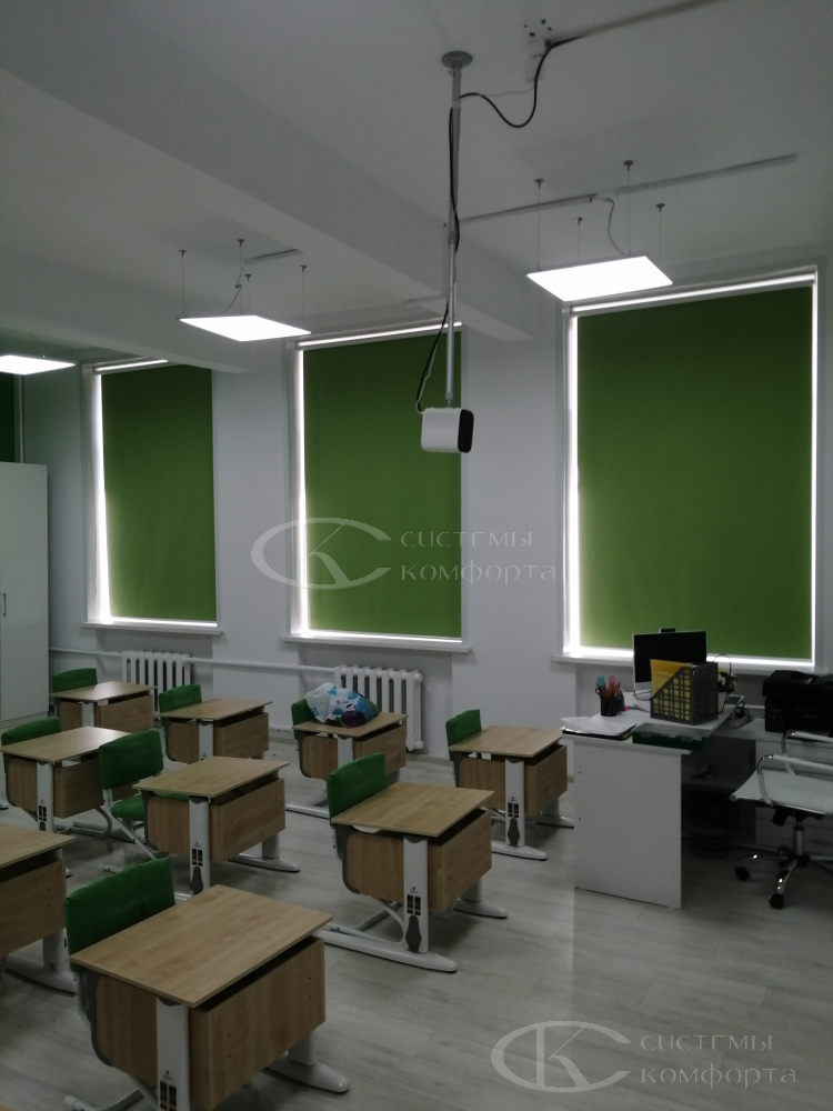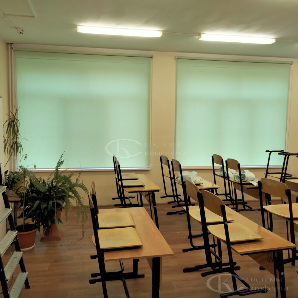 Часто их называют рольшторами. Механизм работы прост: с помощью цепочки ткань поднимается и опускается. Как правило, рулонные жалюзи устанавливают на одном-двух окнах, ближайших к доске, для затемнения в классе, если часто используется в работе проектор. В этом случае рекомендуем выбрать ткань «blackout» со 100% защитой от света. Но в этом случае надо понимать, что сама по себе светонепроницаемая ткань не создает полного затемнения в классе, так как просветы в любом случае будут по краям изделия. Плюсом будет то, что ткань на этапе производства обрабатывается специальными пылеотталкивающими растворами.