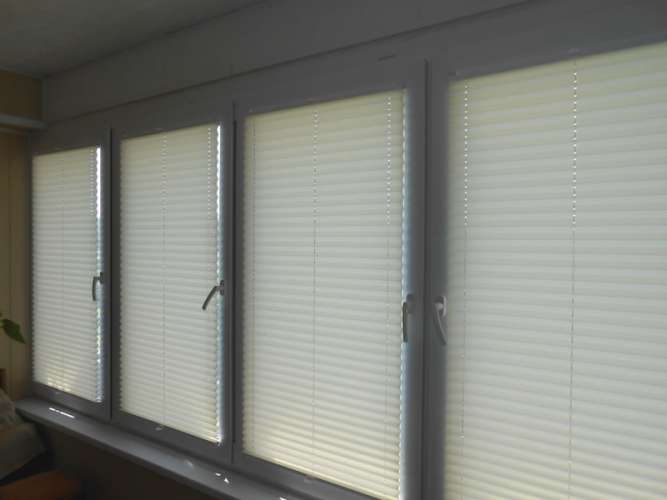 Достаточно дорогой вариант, сочетающий достоинства обычных пластиковых жалюзи и штор. Полотно собрано в чёткие складки, в опущенном виде выглядит как штора, а в собранном занимает минимум места. Особенно эффектно плиссированные жалюзи смотрятся на лоджиях с большой площадью остекления.